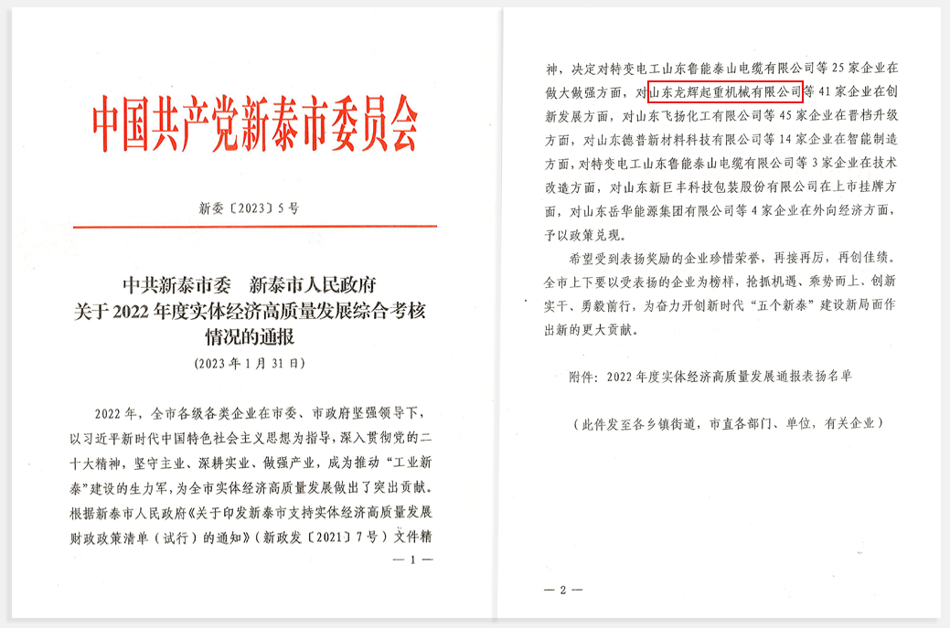 此次獲得多項殊榮,既是對龍輝起重全體職工一整年辛勤勞作的工作成果的褒獎,也包含著市委、市政府對龍輝起重的殷切期望。