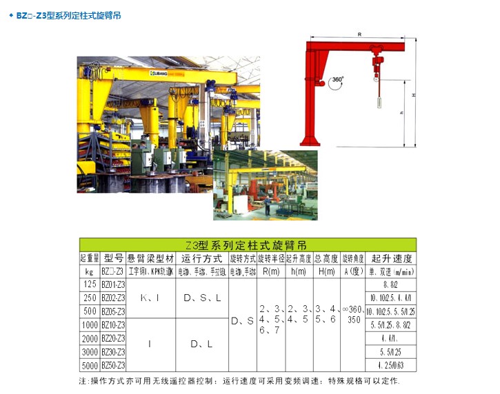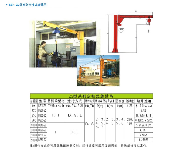 所有的規格都具有一個共同的優點:自重輕,懸臂長,起重量大,安裝、操作、維修簡單。它們完全獨立,是一種理想的工作崗位起重機,并適用于室外的貨場和裝卸平臺。