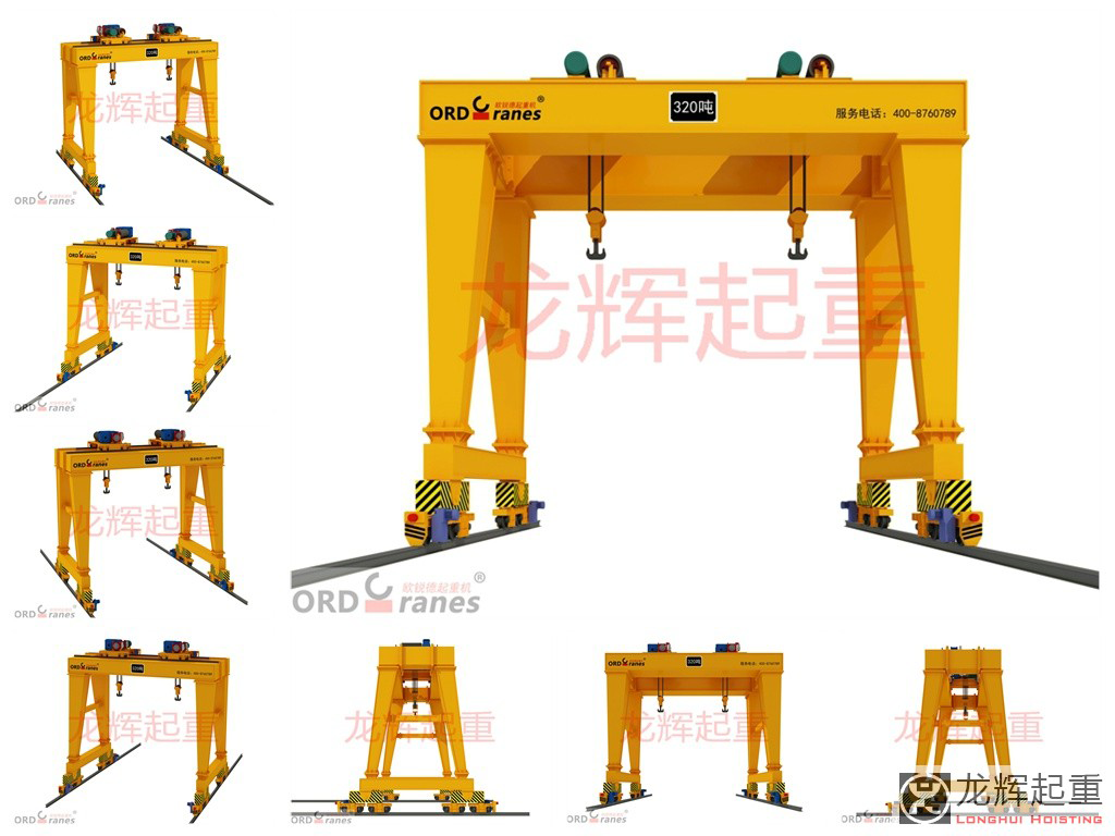 在造船過程中,雙梁龍門吊能實現裝卸各種貨物。造船門式起重機主要用于船體在平臺上的組裝,通常有兩輛起重小車:一輛主鉤兩個,運行在橋架上翼緣軌道上;另一輛主鉤一個,副鉤一個,運行在橋架下翼緣軌道上進行翻車和吊裝。B型船體段,起重量一般為100-1500噸,跨度185米,起升速度為2-15米/分鐘,微動速度為0.1-0.5米/分鐘。