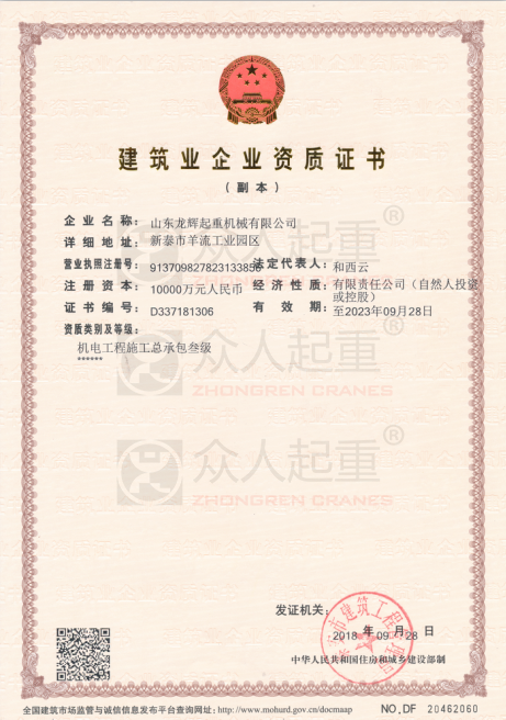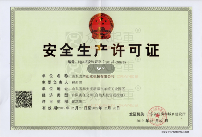 2019年12月27日,山東龍輝起重機械有限公司榮獲建筑施工安全生產許可證。建筑施工安全生產許可證是礦山企業、建筑施工企業和危險化學品、煙花爆竹、民用生產企業必備的一個證件,它和企業資質聯系在一塊,取得建筑施工資質證書的企業,必須申請安全生產許可證,方可進行招投工作來接相應工程,兩個證件是有機整體。