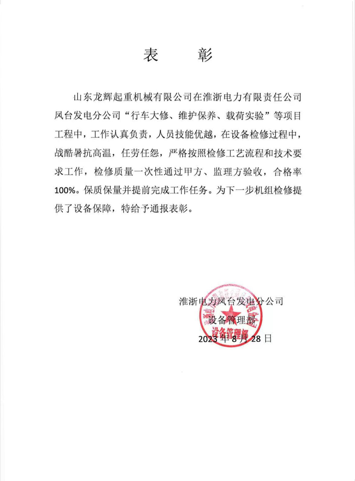 近日,我公司收到濰浙電力有限責任公司鳳臺發電分公司發來的表揚信,對龍輝起重服務人員的敬業態度和優質服務給予了充分肯定和高度評價。