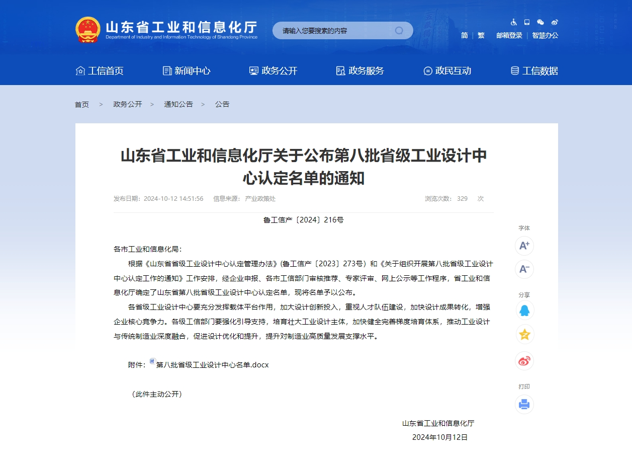 近日,山東省工業(yè)和信息化廳公布了第八批省級工業(yè)設(shè)計中心認定名單的通知。
